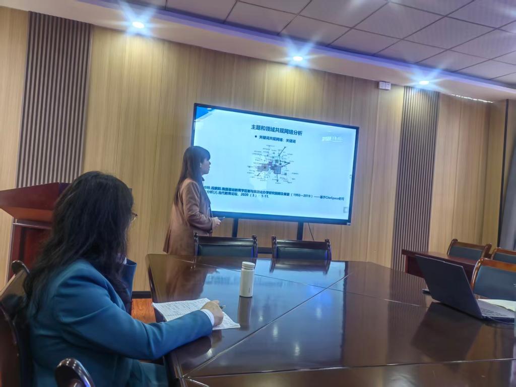 下午的博士沙龙由学院科研工作负责人田琦博士主持。在汇报环节中,杜卿博士利用文献计量学视角对基础教育热点问题进行了全景式扫描,内容详实丰富且极具方法论启发;褚蔚霖博士则聚焦新时代外语教育的转型与发展,以强烈的主人翁意识,就学院在新文科建设与数智化背景下的专业转型路径进行了深邃思考。汇报结束后,万光荣教授对两位博士的分享进行了高屋建瓴的专业点评,在场教师随后也围绕相关议题展开了充分的自由提问与互动交流。